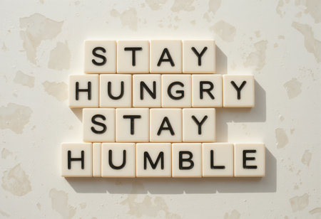 A visually striking display of the motivational quote Stay Hungry Stay Humble arranged on ceramic tiles. This image symbolizes ambition and personal growth, making it perfect for inspirational uses.