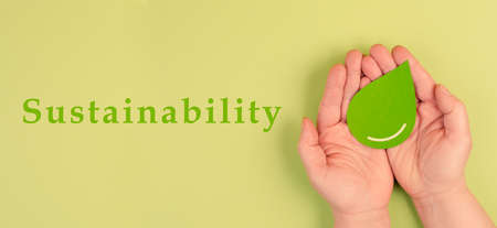 An artistic display of the word Sustainability surrounded by lush green leaves, representing environmental consciousness and natural beauty in a modern setting.