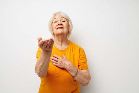 Photo of retired old lady in a yellow t-shirt posing close-up emotions
