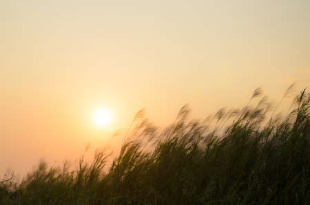 Background of bright sunset sky with sun rays over the saccharum spontaneum or catkin flower forest