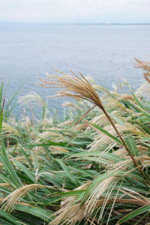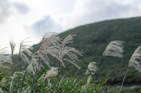 beautiful dry grass panicles growing on beach coast with a cloudy background in rain season at japan rural. copy space, vintage photo and selective focus.