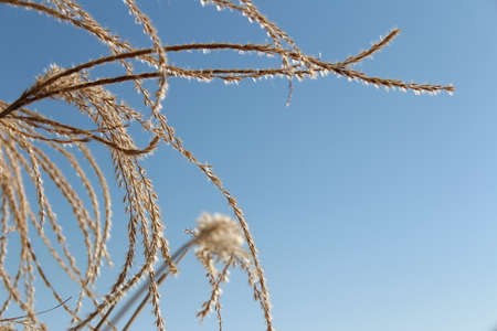 dry brown grassland with miscanthusm in autumn, blue sky.