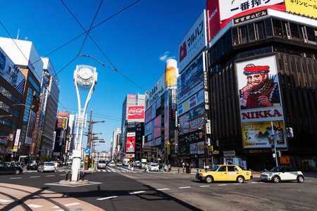 SAPPORO, HOKKAIDO, JAPAN - APRIL 24, 2016: day scene of Susukino intersection. Susukino is one of the three major red-light districts within Japan.