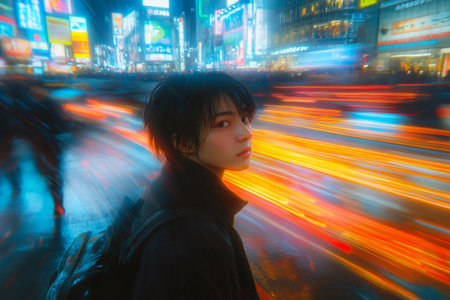 Stylish asian man walking in Shibuya, Tokyo, with blurred lights and light trails