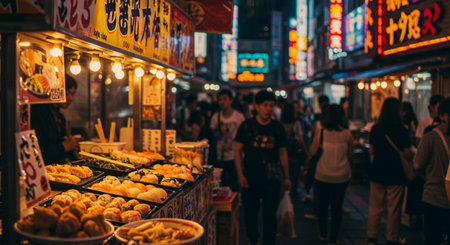 Vibrant cityscape at night with neon signs illuminating bustling street filled with people crossing High resolution urban night scene