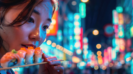 A woman with black hair is holding a tray of sushi, smiling with raised eyebrows and long eyelashes. Her facial expression exudes happiness and cool confidence, enjoying a leisurely and fun moment
