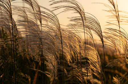 Chinese Silver Grass, Maiden Grass, Miscanthus chinese, Miscanthus sinensis illuminated by soft evening sunlight, autumn background