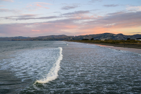 Waves splashing onto New Brighton beach at sunset. Christchurch, New Zealand.