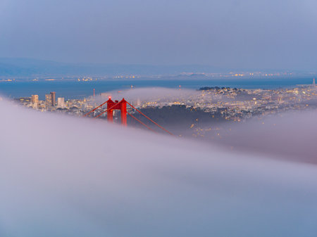 Twilight aerial view of the Golden Gate Bridge with fog at San Francisco, California