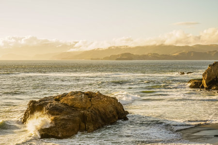 Panorama shot of Pacific ocean, small waves and rock cliffs in California beach at sunset in Usa, America