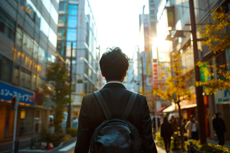 Back photo a businessman walk between buildings. generative ai