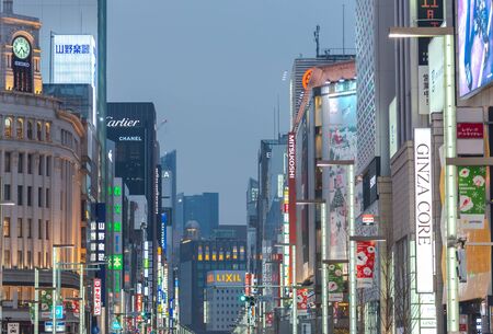 Night View of Ginza District, The District Has Famous Brand Flagship Stores Everywhere, Offers High End Retail Shopping. Text in Japan advertise stores name.