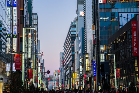 TOKYO - November 28, 2015: The Ginza District November 28, 2015 in Tokyo, Japan. Ginza extends for 2.4 km and is one of the world's best known shopping road districts.