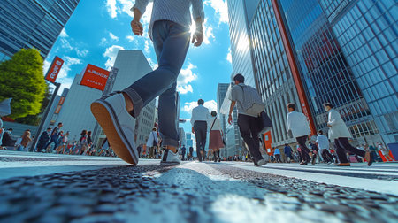busy city workers crossing the street at a low angle