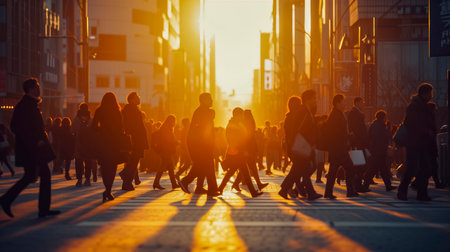 An AI generated illustration of busy pedestrians crossing a road under a sunset sky
