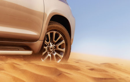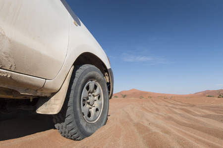 Close-up of an off-road vehicle stuck in deep sand in the Namib Desert, Namibia. Captures real conditions of travel, terrain challenges, and adventure.