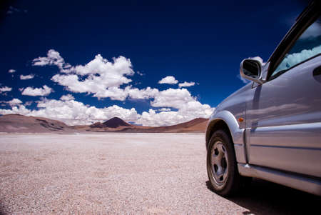 ATACAMA DESERT, BOLIVIA, DECEMBER 31: Off-road vehicle driving in the Atacama desert, Bolivia with majestic colored mountains and blue sky in Eduardo Avaroa Andean Fauna National Reserve, Bolivia 2014