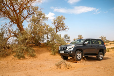 Merzouga, Morocco - September 25, 2019: Offroad car Toyota Land Cruiser Prado 150 in the Sahara desert.
