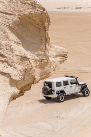 Jeep driving in desert on sandy surface on white sky background. Dune bashing. Safari. Offroad adventure. Travel, travelling. Summer vacation