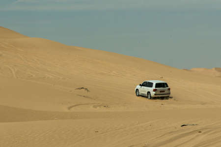 Off-road safari on the golden sands of the desert on a car in Walvis Bay. Namibia. SUV breaks through sand dunes in the desert