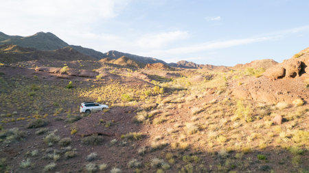 A white car stands with its back on a desert road under the scorching sun between the hills. Tourist topics and travel