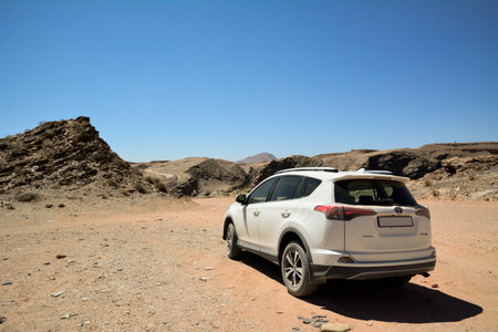 Toyota Fortuner standing in the middle of the Namib desert on a sunny day. Namibia, Africa