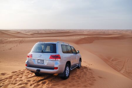 DUBAI, UAE - January 08, 2019: Land Cruiser on the dunes in the desert near Dubai