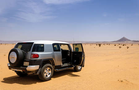 Al-Muzahmiyya, Saudi Arabia - April 24, 2021: An SUV vehicle with an open passenger door in the sand desert.