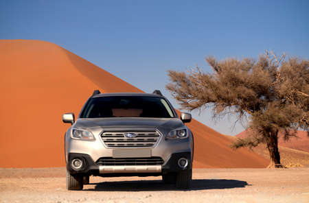 Subaru Outback stands in the middle of the Namib Desert, next to a sand dune of Sossusvlei. 19.08.2021.