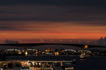 Sunset at riverside and bridges across Chaopraya river in Bangkok, Thailand