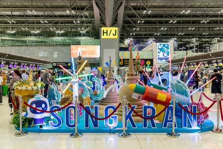 Bangkok, Thailand - April 10, 2023: Interior decoration that represents various aspects of Thai culture is displayed at Suvarnabhumi Airport during the Songkran festival, which is the Thai New Year.