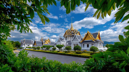 This stunning image showcases a grand Thai palace framed by lush greenery, with a bright blue sky adorned with cloud formations, reflecting cultural beauty and serene atmosphere.