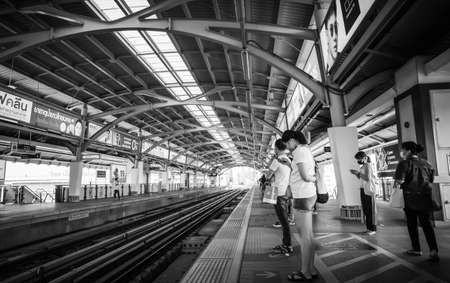 People waiting for the sky train on the Bangchak Sky Train Station at Sukhumvit road, Bang Chak, Phra Khanong, Bangkok, Thailand, June 3, 2020