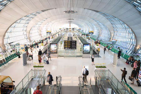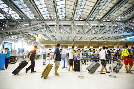BANGKOK, THAILAND - AUG 16,2015: Passengers travel inside Suvarnabhumi International Airport which serves as regional gateway and connecting point for various foreign carriers.