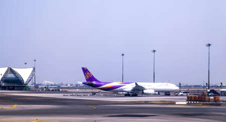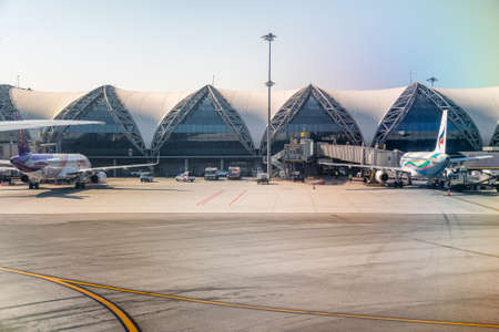 BANGKOK - DECEMBER 14, 2019: Suvarnabhumi airport with airplanes on the runway.