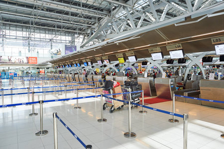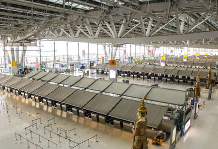 BANGKOK THAILAND APR 14 2021 The public check-in area of an airport without crowd during the Covid-19 epidemic pandemic.