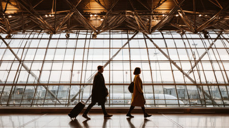 Two friends are seen walking side by side in a spacious airport terminal, each carrying carry-on luggage. The modern architecture creates a stylish backdrop for their journey.
