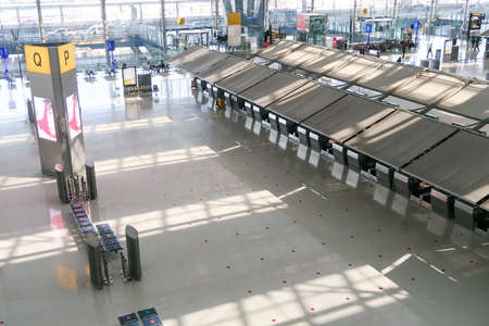 Empty airport check-in counter while coronavirus pandemic and countries lockdown, flight cancellation, bankrupt