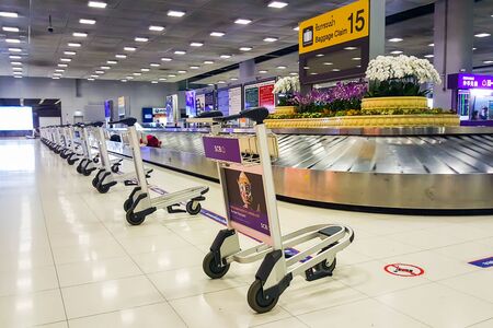 SAMUT PRAKAN, THAILAND - JANUARY 17, 2019: Trolleys are arrayed at the baggage claim belt, Suvarnabhumi Airport.
