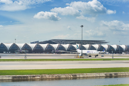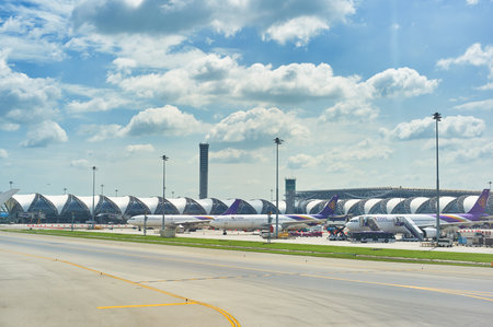 Bangkok, Thailand - June 13, 2017: Terminal building with the airplanes at Suvarnabhumi international airport, Bangkok, Thailand.
