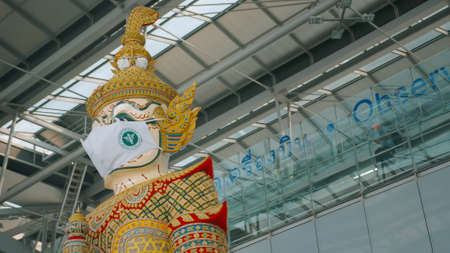 Bangkok, Thailand - September 19, 2021 : thai traditional giant statue at Suvarnabhumi airport wears protective face mask to encourage mask wearing to prevent infection.