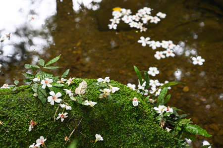 Stones in water with pink flowers in zen garden, Thailand.