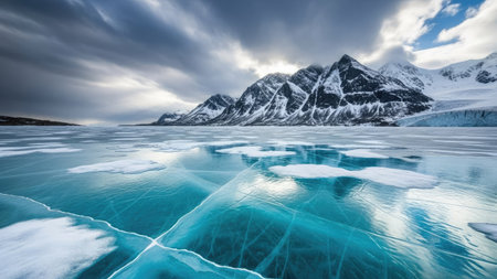 A stunning landscape depicts an icy lake with intricate cracks reflecting a cloudy sky. Towering mountains covered in snow dominate the background, bathed in soft sunlight. The image showcases natural textures and a cold color palette, ideal for editorial or commercial projects highlighting environmental themes and travel.