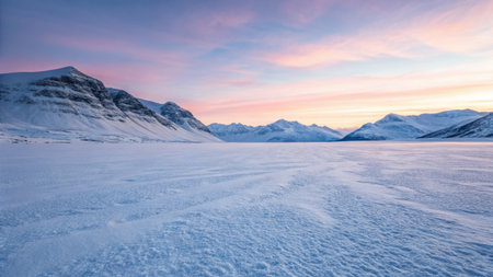 Glacier landscapes plateau sunrise pastel sky over frozen plain with distant snowy mountains creating serene morning light