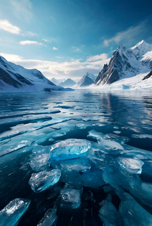 icecaps in the Antarctica with iceberg in the ocean swimming around and melting in the sea