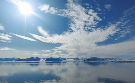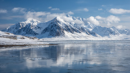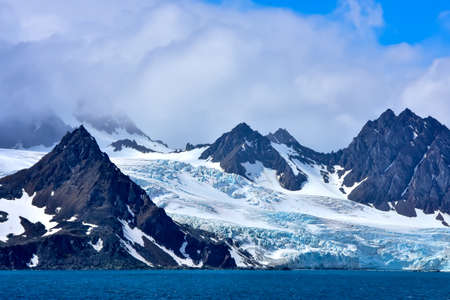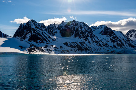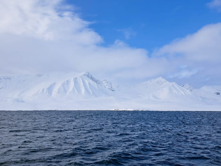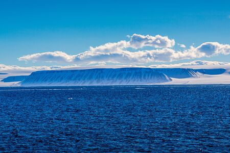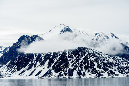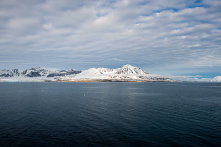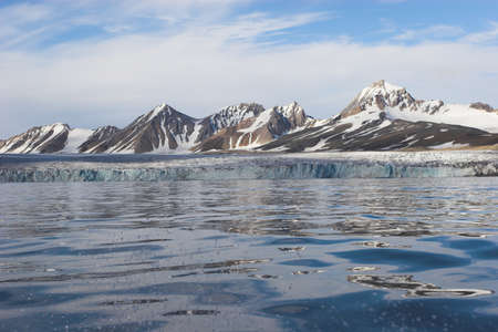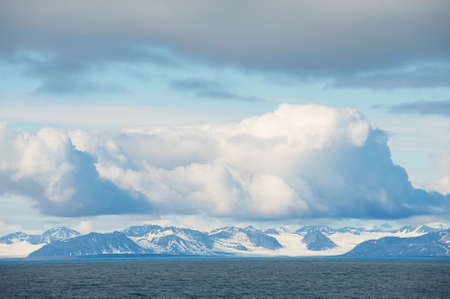 Landscape of Spitsbergen. Photo taken from the arctic ocean. Calm blue sea, white mountains, clear sky with white clouds