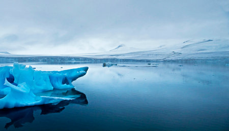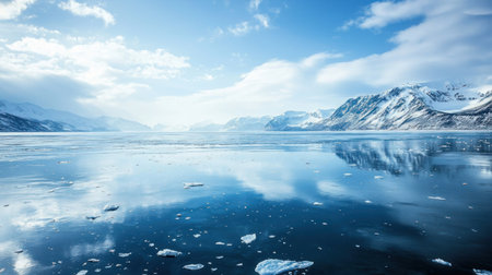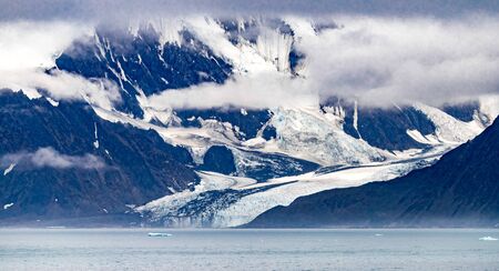 Glacier in mirror sea water landscape photo. Beautiful nature scenery photography with cloudy sky on background. Idyllic scene. High quality picture for wallpaper, travel blog, magazine, article