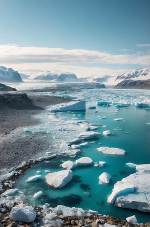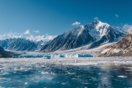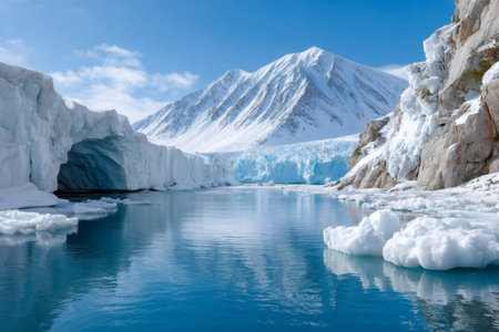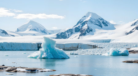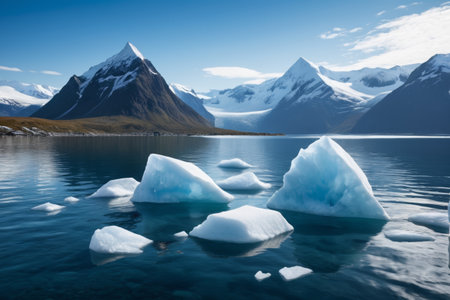 A breathtaking landscape of a glacier with icebergs and a clear blue sky