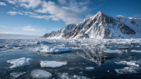 Landscape of snowy mountains by the arctic ocean, Svalbard