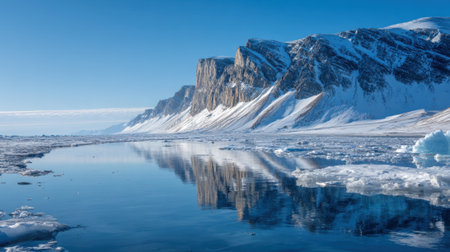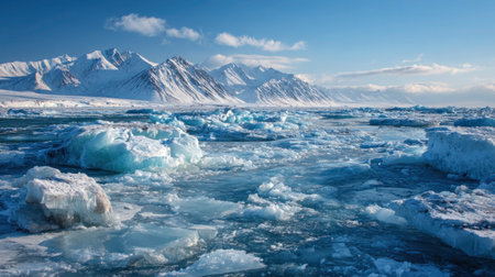 Arctic coastline showcases rugged ice floes under a clear blue sky